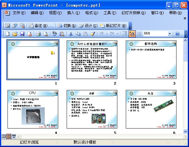幻灯片浏览视图 该视图方式将当前演示文稿中所有幻灯片以缩略图的形式排列在屏幕上,如图所示。