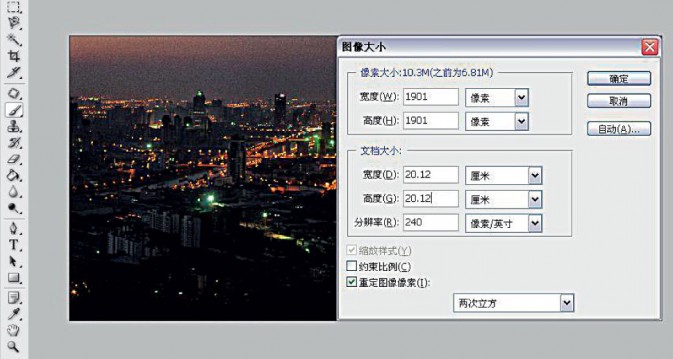 3、我们要对图片进行一下变形,让作品变成完全的方图。选择“图像—图像大小”,在对话框里去掉约束比例的选择,把长宽比例变成正方形,大小就随个人喜好。 |
