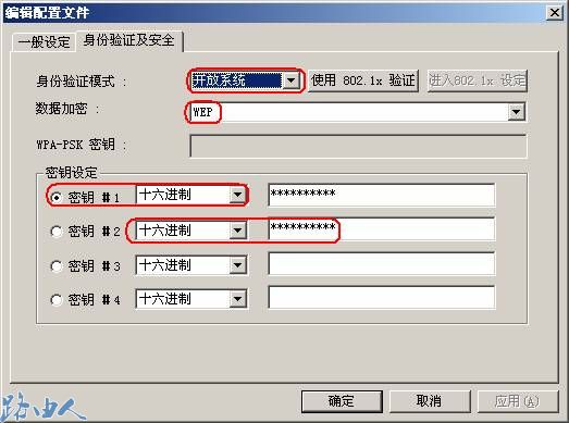 (2)然后点击身份认证及安全页,红线勾勒部分注意选择认证模式,可以保持和无线路由器端相同,由于我们的路由器上选择了“自动选择”模式,所以这里无论选择什么模式都是可以连接的。