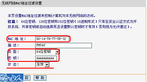 MAC地址参数我们填入的是本例中FW54U的MAC地址00-14-78-77-5F-32,类型可以选择允许/禁止/64位密钥/128位密钥/152位密钥,选择64位密钥,允许和禁止只是简单允许或禁止某一个MAC地址的通过,这和之前的MAC地址功能是一样的,密钥填入了10位AAAAAAAAAA,这里没有密钥格式选择,只支持16进制的输入,状态选择生效。