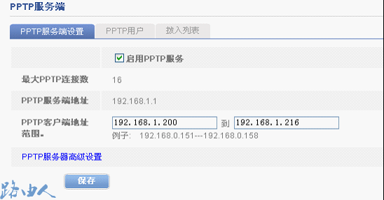 (1)启用PPTP服务,并填写内网预留给拨入用户使用的的IP地址范围,此IP 必须是局域网的内网IP 地址段,下图192.168.1.200到192.168.1.216就是;