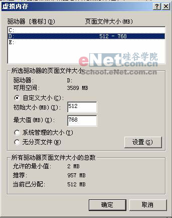 做好这步,然后再点“视觉效果”旁边的“高级”标签,在“虚拟内存”处点“设置”按钮。在打开的属性框里,先将光标定位在C盘,点击下面的“无分页文件”,然后再点击D盘(你机器上哪个盘空间大就点哪个),在自定义大小里输入相应数值,点旁边的“设置”按钮,再点击确定。如下图所示: