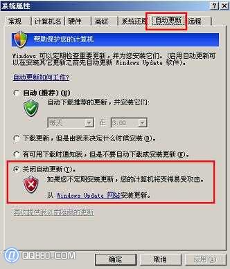 第一步:鼠标右键点击“我的电脑”——>选择“属性”——>将“系统属性”切换到“自动更新”选项卡中——>点击下方的“关闭自动更新(T)”;或者点击“控制面板”——>选择“安全中心”——>在“Windows安全中心”下方点击“自动更新”——>点击下方的“关闭自动更新 (T)”;假如选项为灰色不可选,请看第二步;