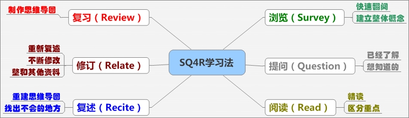 SQ4R: S代表浏览(Survey)、Q代表提问(Question)、4个R分别代表阅读(Read)、复述(Recite)、修订(Relate)、复习(Review)。