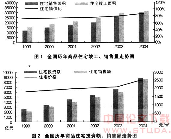 1999-2004年间,全国住宅市场销售面积始终保持高速增长,年均增长幅度达23.34%,而历年的销售面积增长率均高于当年住宅竣工面积增长率,住宅销售量与竣工量之间的缺口从1999年度的4315.65万平方米减少至2004年度的 857.31万平方米,住宅销供比不断接近1,市场表现出强大的吸收能力。2004年住宅销售量为33819.9万平方米。住宅销售额从1999年的 2143.82亿元增至2004年的8619.37亿元,销售额的增长速度虽然经历了先降后升过程,但是最缓慢的2002年也有23.13%的增幅。而且历年住宅销售额的增长速度均超过了当年住宅投资额的增长速度,销售额有超过投资额的态势。