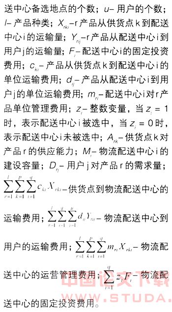 2.模型构造。模型的目标函数是从具有一定生态位适宜度的备选地点中选出一定数量的点作为最佳配送中心,不仅使从供货点到配送中心的运输费用、配送中心到用户的运输费用、流经配送中心的产品管理费用以及配送中心的固定投资费用的总和最少,而且要具有很强的适应性。因此,目标函数要使物流费用最小,所以可用公式表达如下: