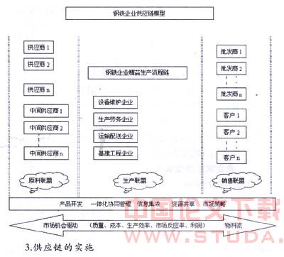 由于钢铁企业属于制造型企业,生产工艺的过程有连续性生产和离散性生产,一般大型钢铁企业的生产组织既有备货型生产(MTS),也有订货型生产(MTO),甚至有按订单装配式生产(ATO)。其供应链的管理涉及到从原材料的采购,物料的运输,产品的生产,面向用户的销售等各个环节。钢铁企业的赢利的手段和主要的核心部分是产品的生产,因此怎样在生产上发掘最大的价值是构造供应链的重要问题。精益生产(Lean production)这个词是由IMVP的研究者John Krafcik发明的,这种生产方式在能源紧张、原材料价格上涨、工资提高、消费需求多样化的年代显得格外突出。钢铁企业要吸取这种生产的思想,用这种思维来指导企业的生产经营策略。当然,支撑钢铁企业供应链建立的需要一种合适的企业组织形式,而动态联盟可以解决这个问题。精益的思想是生产的价值流中根除一切不能为产品的带来增值的浪费,包括不必要的停滞时间,从而确保一种水平的、稳定的调度管理。动态联盟则意味着在一个时刻变化的市场空间里,利用市场信息和虚拟的组织形式来把握可赢利的机会。两种管理的思想的都是面向市场、面向客户的,在整个钢铁企业供应链中精益思想和动态联盟在不同的层面上都可以发挥自身的优势。