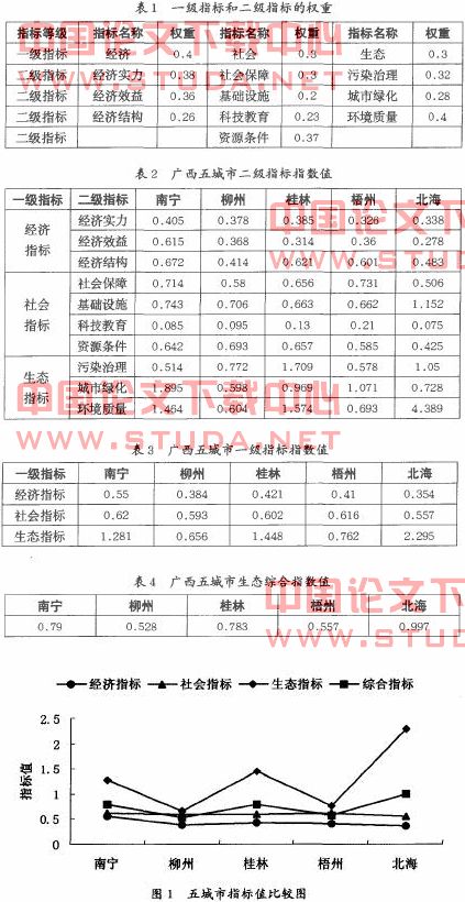 根据上述生态城市指标体系和评价方法,选择南宁、柳州、桂林、梧州和北海五个城市作为评价对象,计算各级各项指标的指数。结果见表2、表3、表4和图to