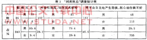 每个人部知道当众练习或比弃时心理因素对自我感觉的影响,就自己的心理活动来说,这种影响类拟子演讲家、授课者·领导者在台上向听众讲演时依脸到的那种紧张情况。从表3调查统计结菜衷明,在对待观众多和环境喧闹方面,特别我国大学体育课基本上在室外上·环境更开放,一般男生在心理上较稳定,不太领会别人愈见。而女生喜欢在观众少,且比较安辞的条件下进行练习。因此对于男生来说,观众精神上的支持.影响最一般性的.而对女生来说,这个因素是应激性的.女生大都否认观众精神上的支持是调动她们能力的盆要因紊。在承认观众形响不大的85名学生中。女生只占其中的9. 4纬。总的讲,无论男生还是女生在练习时部不喜欢旁边有其他人从表3中发现观众这个因素会使学生产生心理紧张占46,右%,故“列席效应”是非常明显的。