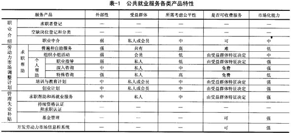 尽管公共就业服务的制度安排、任务、战略和组织在不同的国家千差万别,但各种职能服务产品却有许多共同的基础。下面以国际劳动组织公认的四项基本职能为支点(如表-1所示),具体分析服务产品的特性。