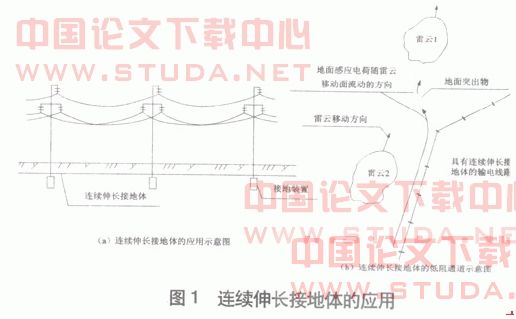 对于山顶上且高土壤电阻率无避雷线的杆塔和横担接地,并采用连续伸长接地体将每基杆塔的接地装置连接起来的措施,如图1所示,形成一条低电阻通道,可以防止杆塔顶部和杆塔附近的地面突出物的雷电场强发生畸变,即防止线路遭受雷击,同时提高了线路杆塔的平均高度,减少了杆塔、避雷线等投资费用。