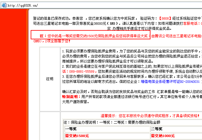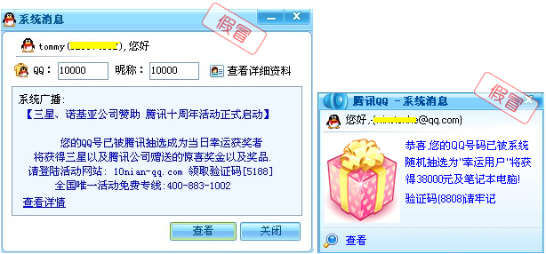 近来,腾讯公司收到热心QQ用户的举报,反映一些不法分子以“QQ号码中奖通知”等假冒系统消息的名义发布诈骗信息,借机骗取QQ用户钱财。对此,腾讯QQ安全团队提醒广大用户,不要相信任何“QQ中奖”消息,更不要向诈骗分子汇款。据了解,此类假冒系统消息实为木马病毒,网络诈骗团伙通过木马病毒入侵用户系统,伪装成QQ系统消息,将其引导到诈骗网站,用户仅通过外观很难辨认。为此,QQ安全团队特别提供了“假冒系统消息病毒”解决方案,并公布该病毒的详细特征,希望广大网友加强安全防范意识,不要上当受骗。 QQ安全团队提醒广大用户不要相信任何“QQ中奖”消息,更不要向“网络活动”组织者汇款(无论任何理由任何金额),最大限度地保护个人信息和财产安全。 A 预防保护方案 2、验证网址安全 3、举报可疑 B 病毒查杀方案 C 损失钱财补救方案 QQ安全团队专门设立了“网络骗术举报”专题讨论区,公布了最新的网络诈骗案例,用户可以访问讨论区及时了解最新骗术以及讨论、举报疑似诈骗信息。如果您还需要进一步的咨询,请访问腾讯客服中心网站获取更多的帮助信息。 附:《腾讯公司提醒QQ用户谨防诈骗的公告》 QQ安全工程师分析发现,与传统病毒不同的是,此类假冒系统消息病毒不盗号、不破坏正常文件,仅发布诈骗消息。该木马病毒常利用“下载器”病毒进行传播。 注:“下载器”病毒是一种木马程序,一般会捆绑多种类型的病毒文件,通过某种途径(如利用系统漏洞攻击、下载电子邮件附件)侵入用户计算机并运行后,会自动从一个或多个网络地址下载新的病毒或木马文件,导致最新病毒源源不断地到达指定计算机,从而达到盗号等恶意目的。 该病毒入侵用户的计算机后,会自动弹出伪造的QQ系统消息。用户一旦点击,就有可能感染上此类病毒,在不知情的情况下被引导到诈骗网站,一些病毒“变种”甚至能够在用户启动QQ后再弹出消息,通过技术手段非法获取用户的QQ号码和昵称。 木马病毒伪装成QQ系统消息界面: 用户一旦点击“查看”按钮,就会访问不法分子预定的诈骗网站。以下是最近收集到的诈骗网站地址: 这些网站通常是骗子自行注册的网站,他们通过制作虚假的活动信息、虚假的高额奖品、虚假的公证材料,千方百计诱使用户相信QQ号码的确“中奖”。 当用户与不法分子取得联系后,对方就会以税费、手续费等借口要求用户汇款。当然,一旦用户进行汇款操作,对方则会试图继续诈骗,直到用户发觉上当后,诈骗分子就会立即消失。一、“假冒系统消息病毒”解决方案
