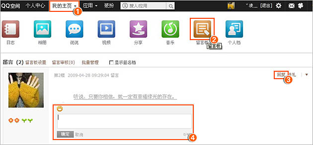 登录QQ空间留言板,在需要回复他人留言的右上角点击“回复”后,输入内容‘确认’即可。如图:
